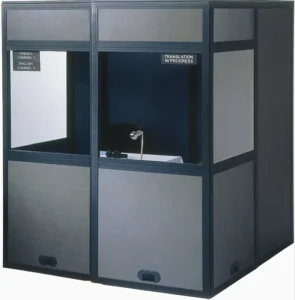 • Cabine com isolamento acústico e equipamento apropriado (central de tradução)