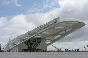 Virado diagonalmente para o céu do antigo porto do Rio de Janeiro, é um edifício do outro mundo que parece um cruzamento entre um dinossauro movido a energia solar e uma unidade de ar condicionado gigante.